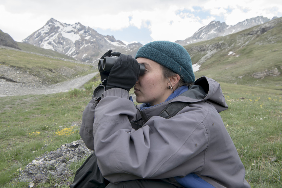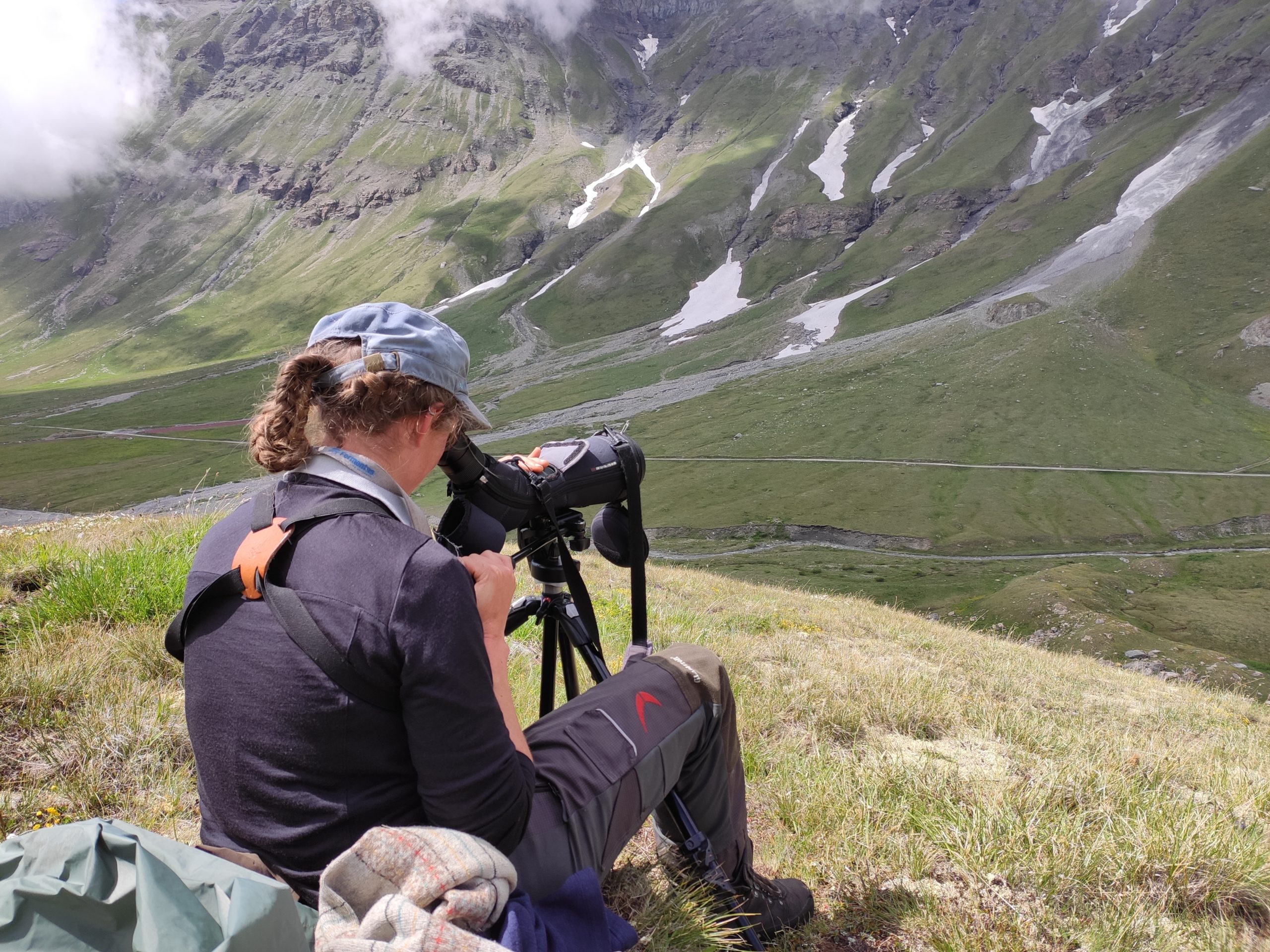 la marmotte - Une étudiante observe les marmottes alpines à distance