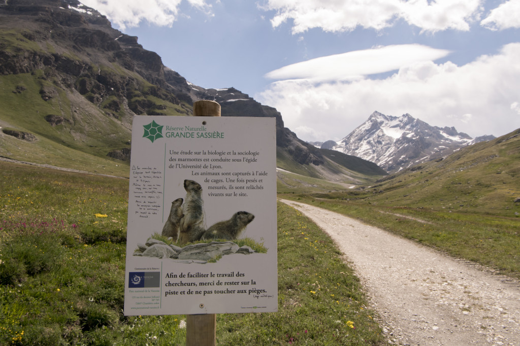 Entrée dans la zone d’observation de la marmotte alpine, dans la réserve de la Grande Sassière