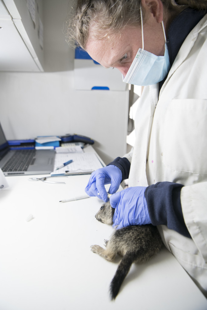 A cette longue étape de capture succède une phase de manipulation qui elle se doit d’être la plus rapide et efficace possible pour limiter le stress des marmottons. Sylvia Pardonnet enchaîne méthodiquement une série de mesures sur les marmots anesthésiés : pesée, taille du corps, des pattes, des dents ; prélèvement sanguin et de poils. Les marmottons sont aussi bagués et pucés pour les identifier au sein de la population sur le territoire. La manipulation dure ainsi une vingtaine de minutes. Puis les marmottons seront relâchés sans garder aucun stress lié à leur capture.