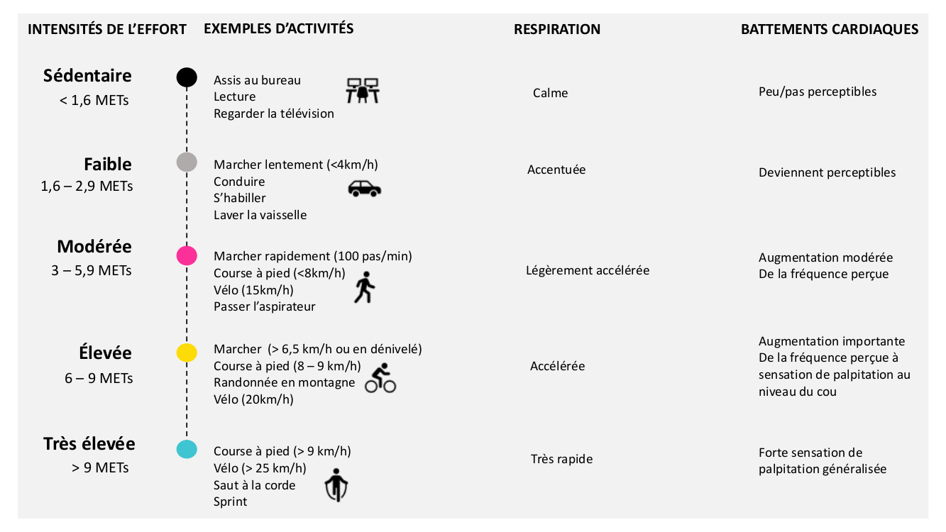 Au sujet de l’intensité des séances d’activité physique et sportive, le MET (metabolic equivalent of task) est l’unité permettant d’évaluer la dépense d’énergie d’une activité et donc son intensité :